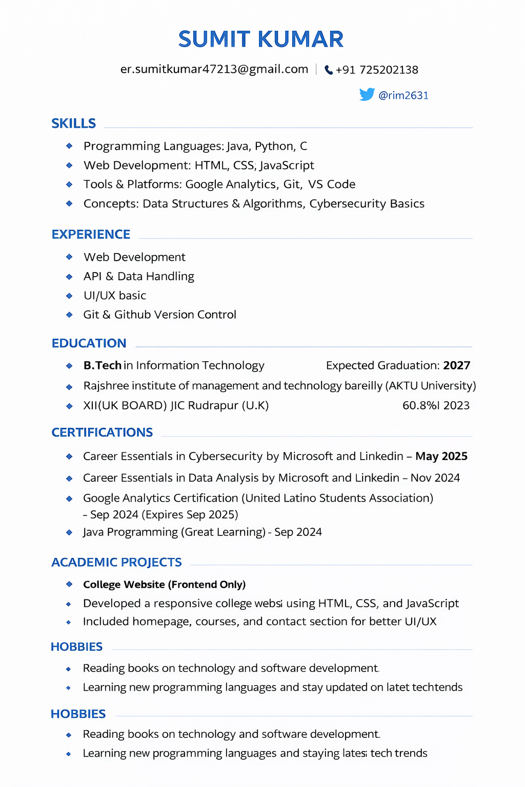I am Sumit Kumar, a frontend developer and B.Tech (IT) student (AKTU, 2027) crafting responsive products with clean UI, APIs, and automation workflows.